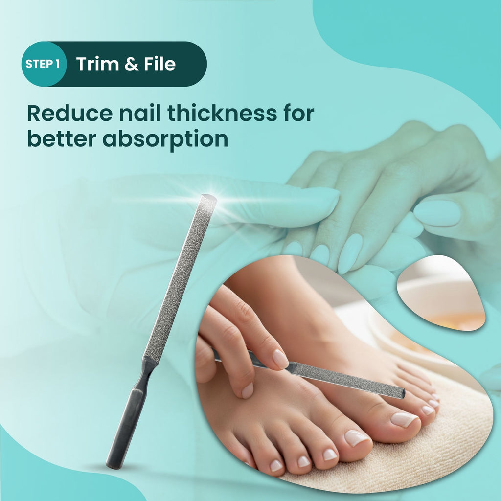 It’s important because: reducing the nail mass allows the topical solution to penetrate to the nail bed, where the fungus lives.